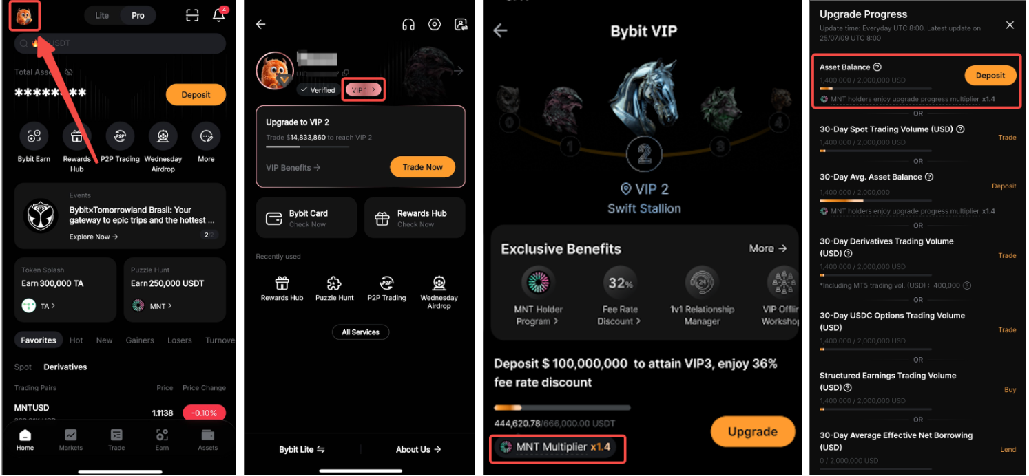 If you're using the app, tap your profile picture in the upper-left corner, then tap your VIP level to view your MNT multiplier status.