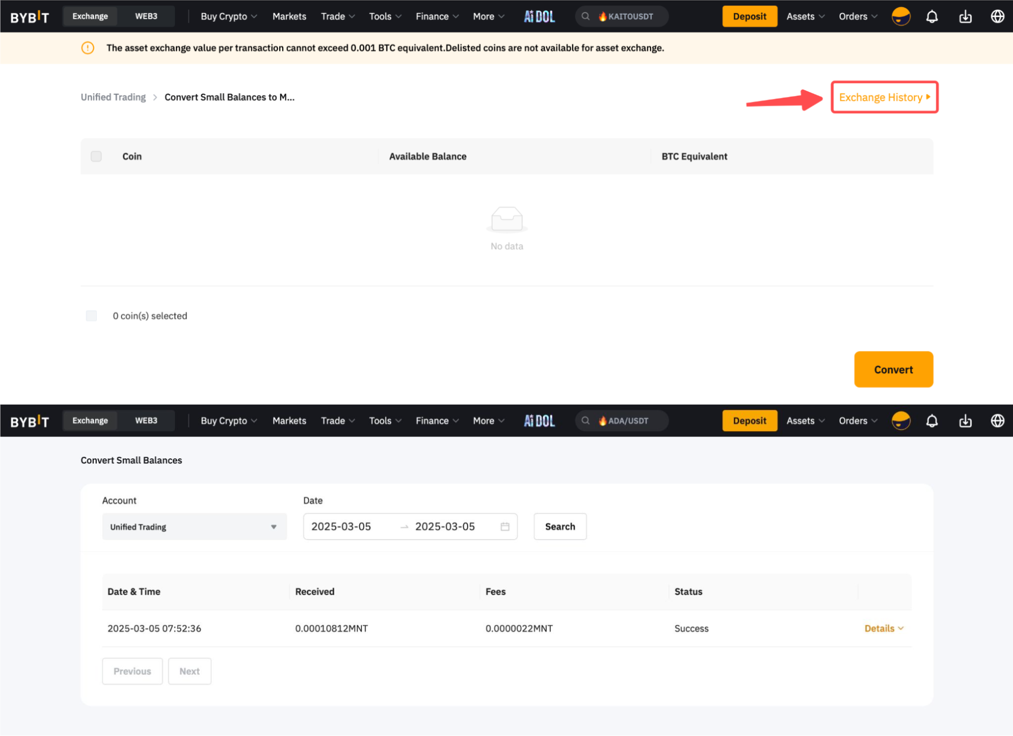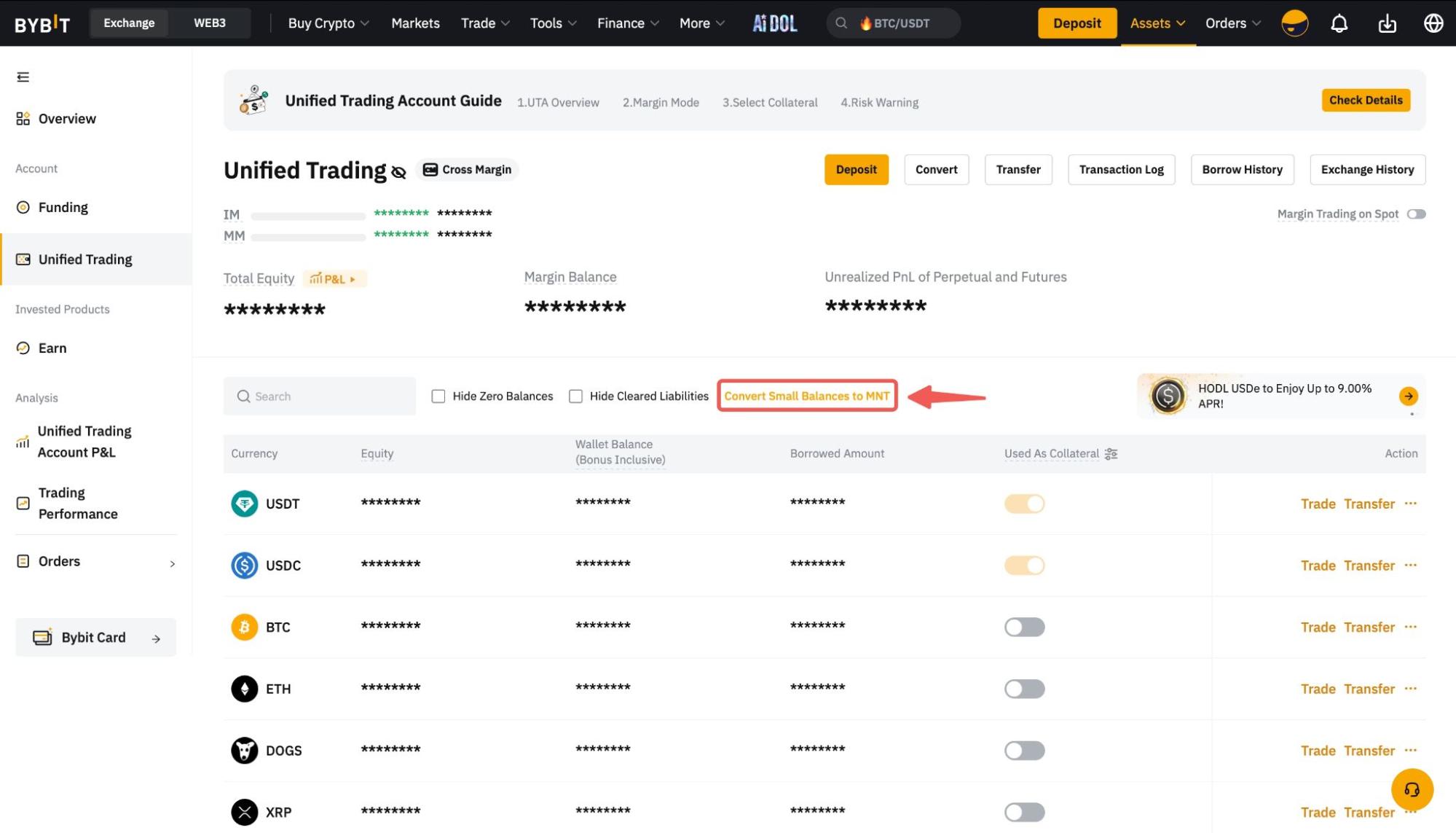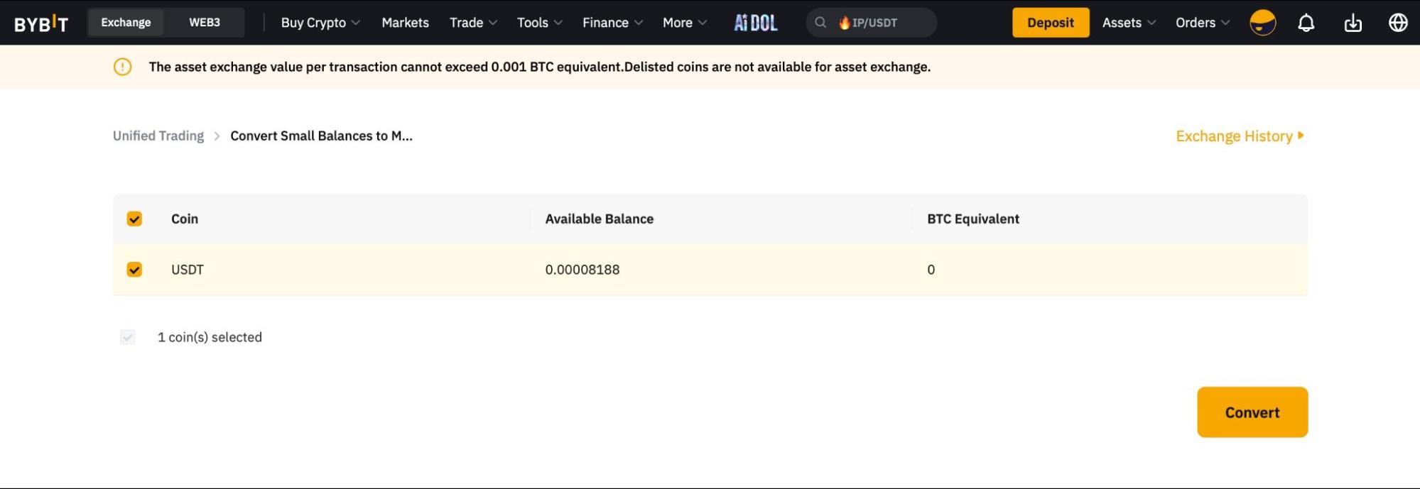 Bybitアカウントの少額資産の利用率を向上させるため、次の4つの簡単なステップを踏むことで、0.001BTC未満の資産または同等の資産をMNTに1回で変換することができます。少額残高のMNTへの変換を行うには、統合取引アカウント(UTA)ユーザーはUTAに資金を振り替える必要があり。 少額残高の変換は6時間毎に1回行うことができます。
