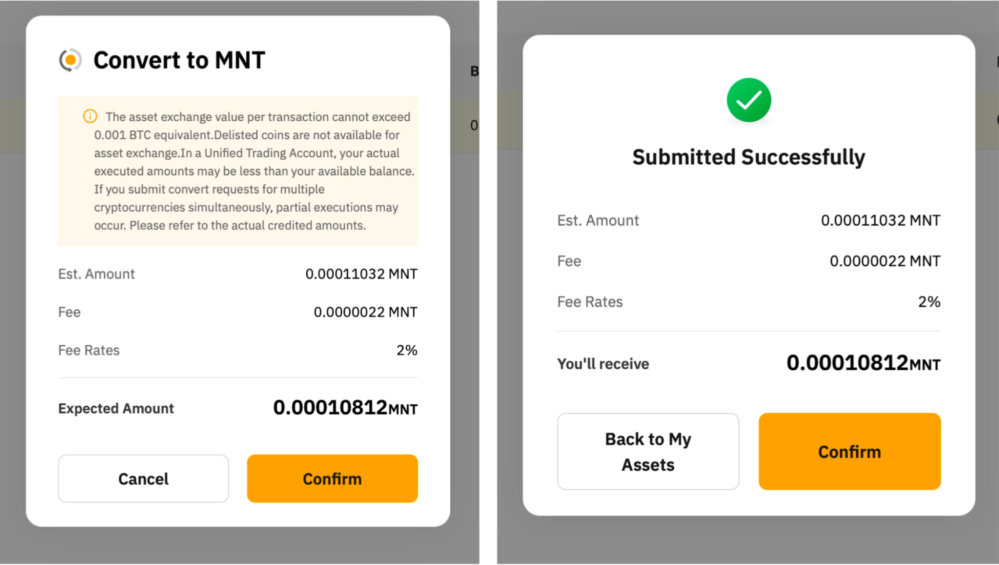ステップ2:少額残高の変換をクリックしてMNTに変換可能な資産の一覧を表示します。